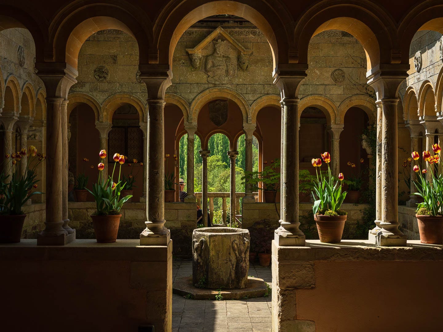 Step inside, and the hush is profound. The quiet of a monastery, warmed by sunlit cloisters. Covered passages wrap around the Italianate courtyard, the surrounding arcade, rising and falling around the space, framing views through the single central courtyard, basking in the golden sun.