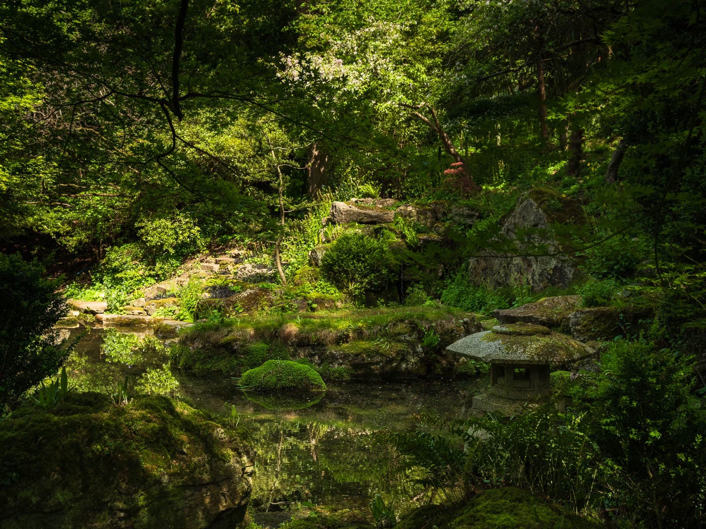 Touches of the Orient appear shyly: a radiant white cherry tree in full blossom beams spring sunlight into the scene; in contrast, a squat stone pagoda, immovable, crouches in the deep shade at the other end. Hewn stone steps guide you onward, past another pagoda tucked into a living alcove of trees.