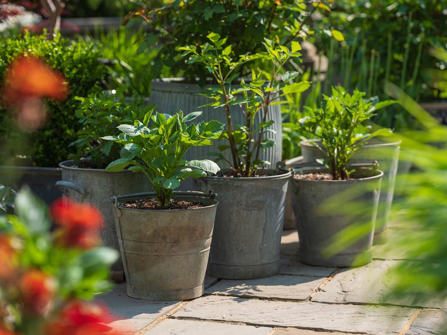 I’m planting mine in large galvanised buckets. Ideal because the minimum pot size for dahlias is pretty generous. Most varieties are ravenous for nutrients and space, so aim for a container at least 30 cm across and 30 cm deep, larger if you can. A bucket is really a bare minimum.