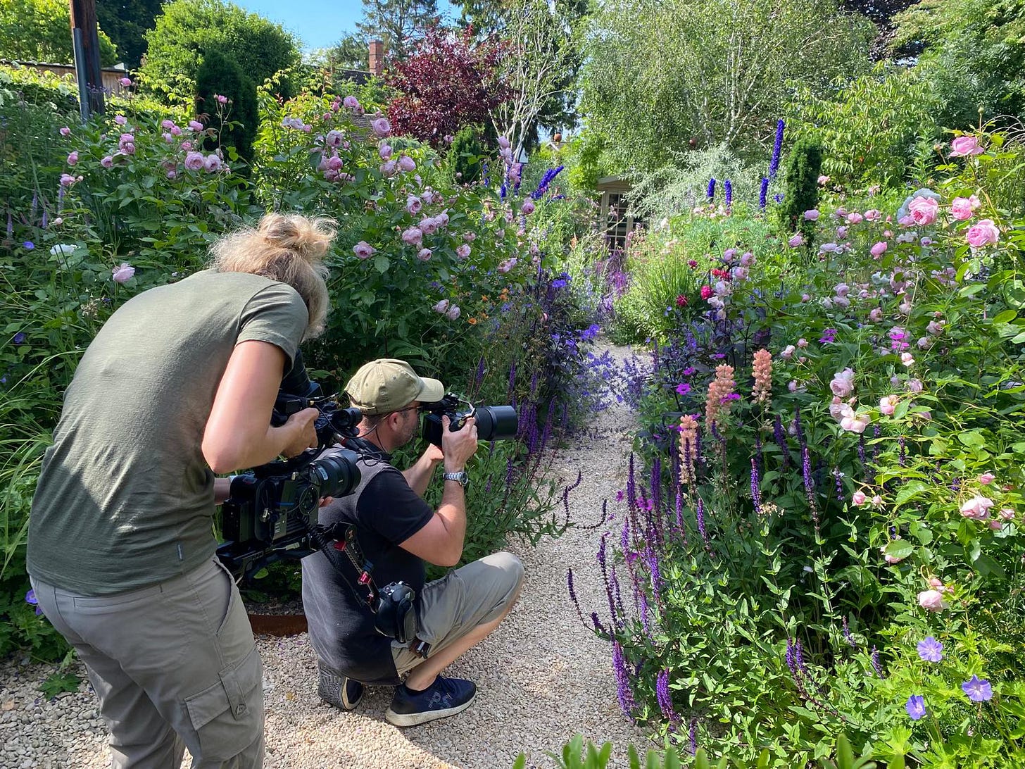 The sun was scorching… Blistering, really. Bees and hoverflies zoomed around like tiny rocket-fuelled helicopters. The roses were just ever-so-slightly past perfect, hence the rush; after a last-second spruce, they looked glorious. Even the freshly-picked peas tasted extra-sweet that day, and the crew had me popping them take after take. We explored the garden, then they asked if they could film me, photographing the plants. Who am I to refuse?!