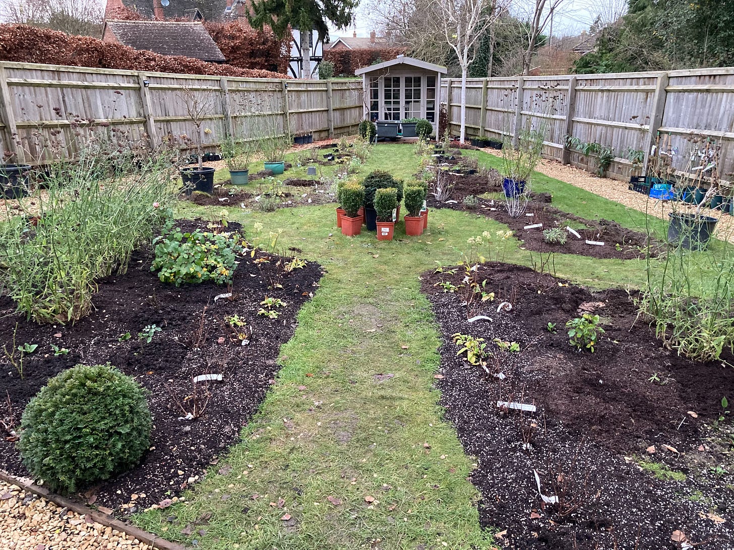 But by the end of that first phase, I had four quadrant beds, crisply edged grass paths, and a central green circle. From the terrace steps, you couldn’t even see the side paths, so the borders looked endless. It was neat, intentional, and almost suspiciously well-organised — the kind of tidiness that makes visitors squint and ask, “So… when’s the magazine shoot?”