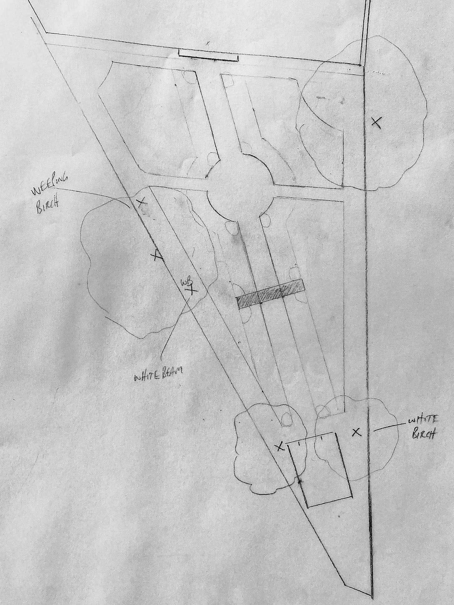 Then came the sketches. I drew curved borders, sweeping borders, serpentine borders. Formal square divisions, triangles, intersecting circles, meandering paths. Each version lasted about five minutes before getting binned. Or chewed by the dog. Or both.