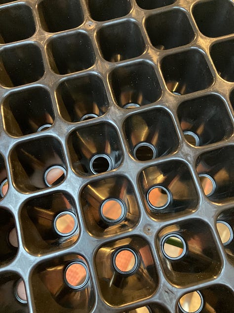 Root trainers. These are deep pocket packs that clip together. Broadly recommended and widely used for the largest seeds with the fattest, strongest roots, like peas or beans. Again, I use these very rarely now. I find them a fiddle and a faff. I also haven’t found any benefit over my next option…