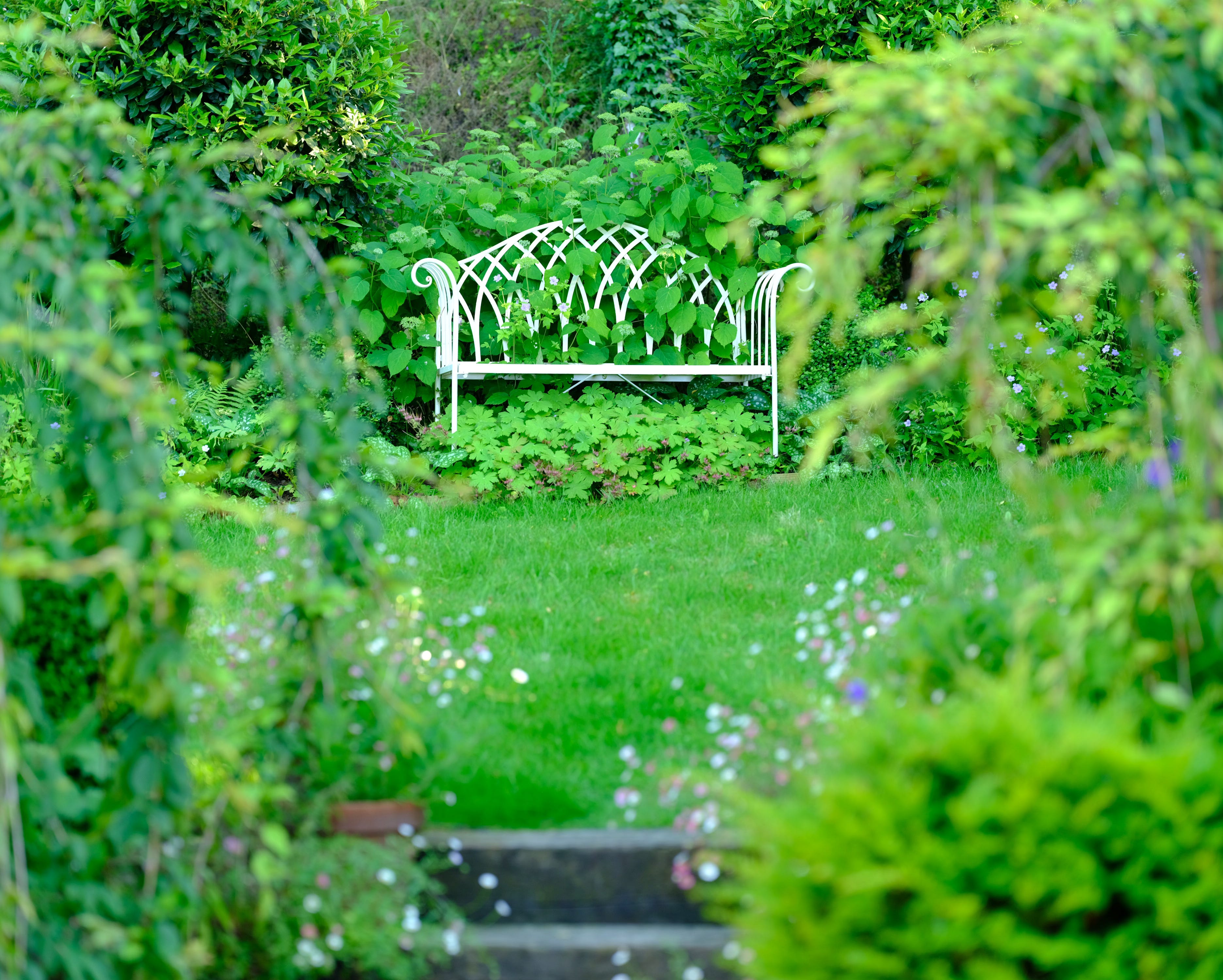 Bright white benches are used throughout the garden as convenient ‘attention grabbers’ and they’re all modest purchases. Our Lutyens-style white benches were flat-packed from Wayfair. The small white loveseat was a bargain from a local vintage dealer. The white Cottage Garden bench and Courtyard Garden bistro set are from mainstream garden centres. They've just been allowed to age, letting nature do its thing, without worrying about a little rust… isn’t that ‘shabby chic’ patina?!