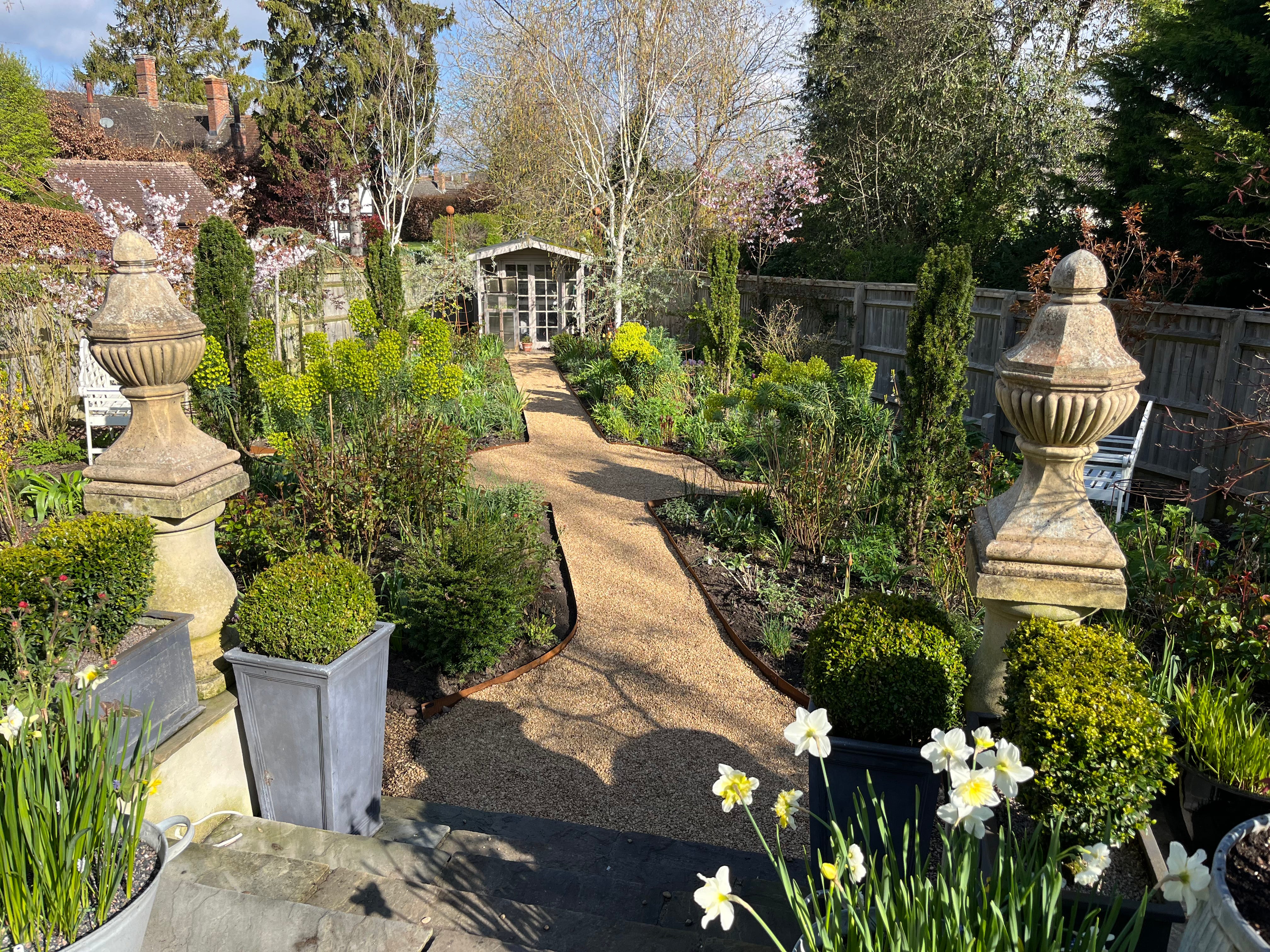 In my garden, harking back to the Arts & Crafts philosophy, we use local Cotswolds gravel throughout to connect all the spaces together. Right from the main gates, through the driveway, around the Kitchen Garden and down the Flower Garden path. In the Cottage Garden, now mostly hidden by the yew hedge, there are original railway sleepers still with the nuts and bolts, used as a retaining wall and the garden steps - a nod to the nearby railway town.
