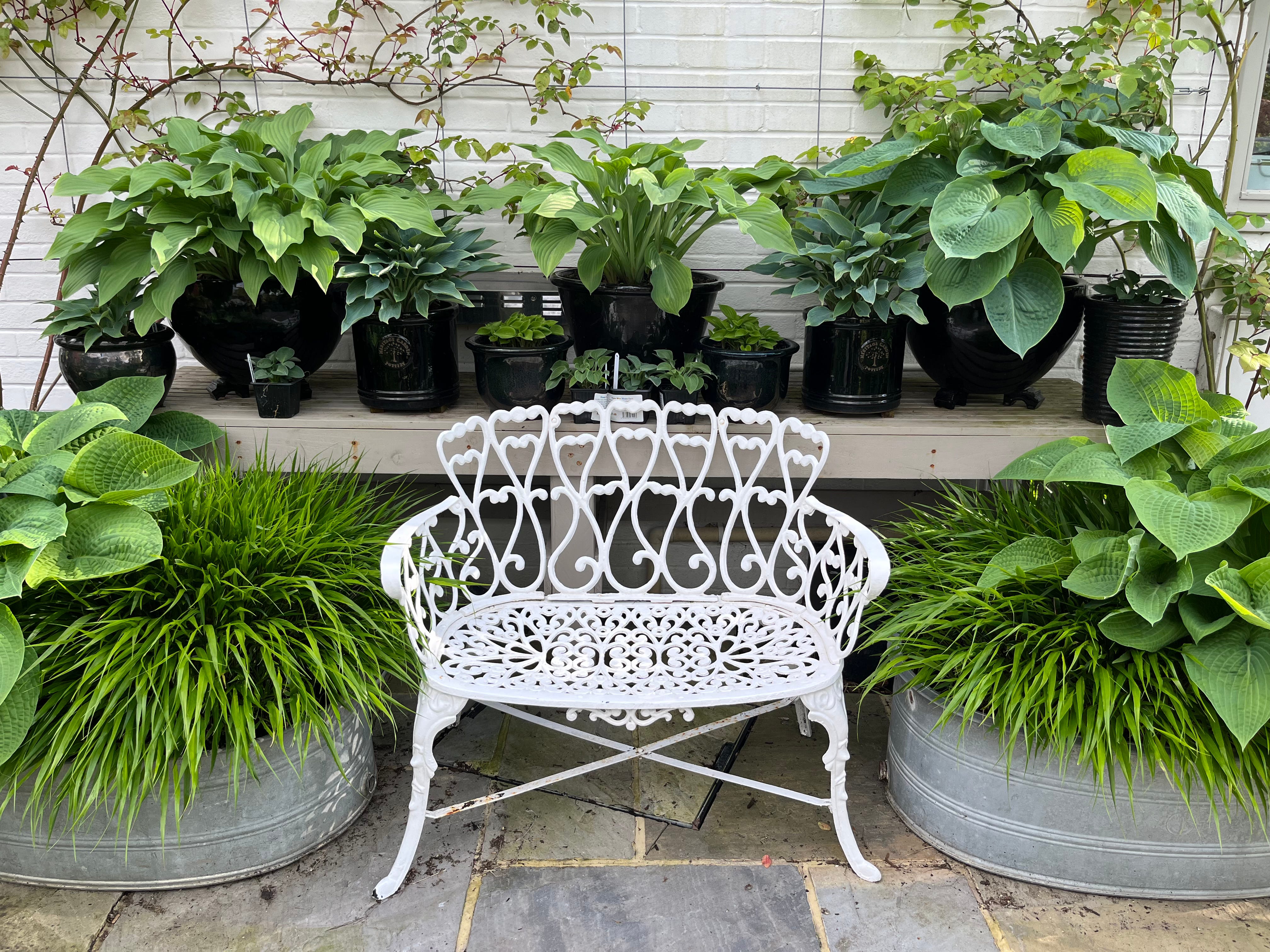 Although it is definitely worth buying ‘vintage galvanised’ (because modern fabrications are paper thin and rust through in a year and are, quite frankly, a total rip-off), you don’t need everything to be vintage or antique. Sometimes the cost is prohibitive, especially when you look at metal benches and furniture. For example, original Victorian Coalbrookdale benches sell for £££ thousands! Genuine antique Lutyens benches are over £1,000 too.