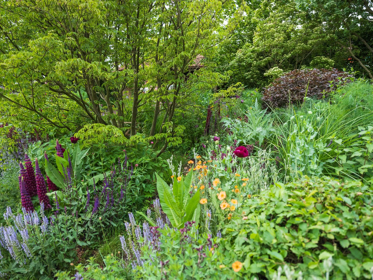 The borders were beautifully planted, with the dark plum spires of Lupin ‘Masterpiece’ rising through the froth, one of those plants that cropped up again and again across the show, and for good reason. At the front, a dense screen of planting kept the clamouring onlookers (myself included) at bay, giving way to a simple lawn scattered with well-chewed tennis balls.