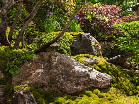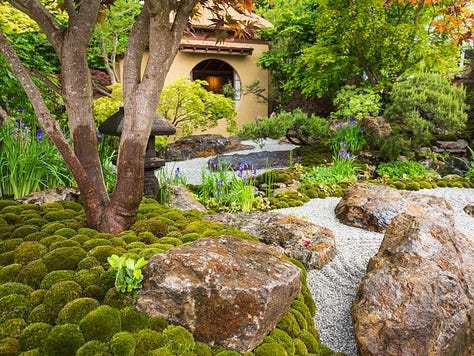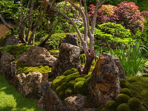 Ishihara’s signature style was unmistakable: painterly layers of moss, sculptural rocks rising with natural ease, cascading water, and soft raked gravel (hōkime), all guided by the principles of ikebana and traditional Japanese aesthetics. And of course, the tea house and those exquisite Japanese maples, each one placed with surgical precision.