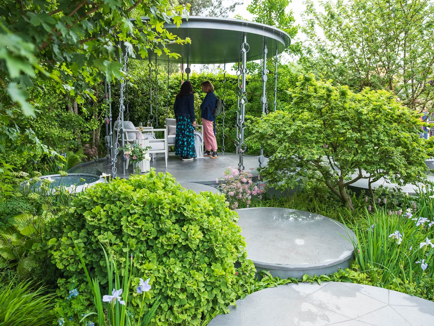My joint favourite, and a perfect companion in spirit to Cha no Niwa, was the Boodles Raindance Garden by Catherine MacDonald. Another space that exuded calm and quiet confidence, it felt like stepping into a tranquil dream. Inspired by the delicate patterns formed when raindrops land on water, the garden featured a series of circular pools offering dancing shimmering reflections, Brandy Crag slate paving pads with etched concentric circles, leading to a platinum-coloured Raindance pavilion.