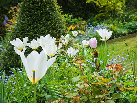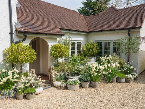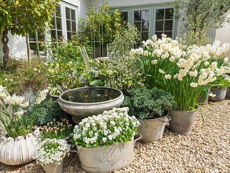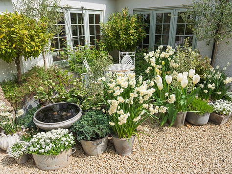 They’re all jostling shoulder to shoulder, cheerfully overflowing with white blooms: purest whites, buttery creams, palest creamy yellow from narcissus, tulips lifting their creamy white goblets skyward, and bright white iberis tossing peppery perfume into the mix like it’s seasoning the air. Primroses and muscari chime in too with their lemon drops and grape juice. The perfume hangs heavy here in the Courtyard, lush, rich, and heady, like Spring is wearing her best party fragrance.