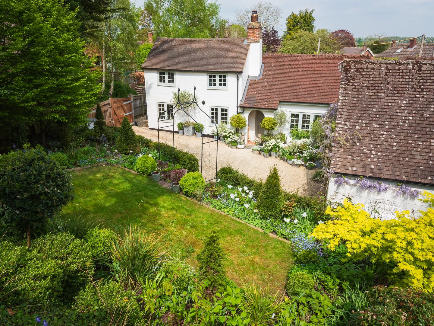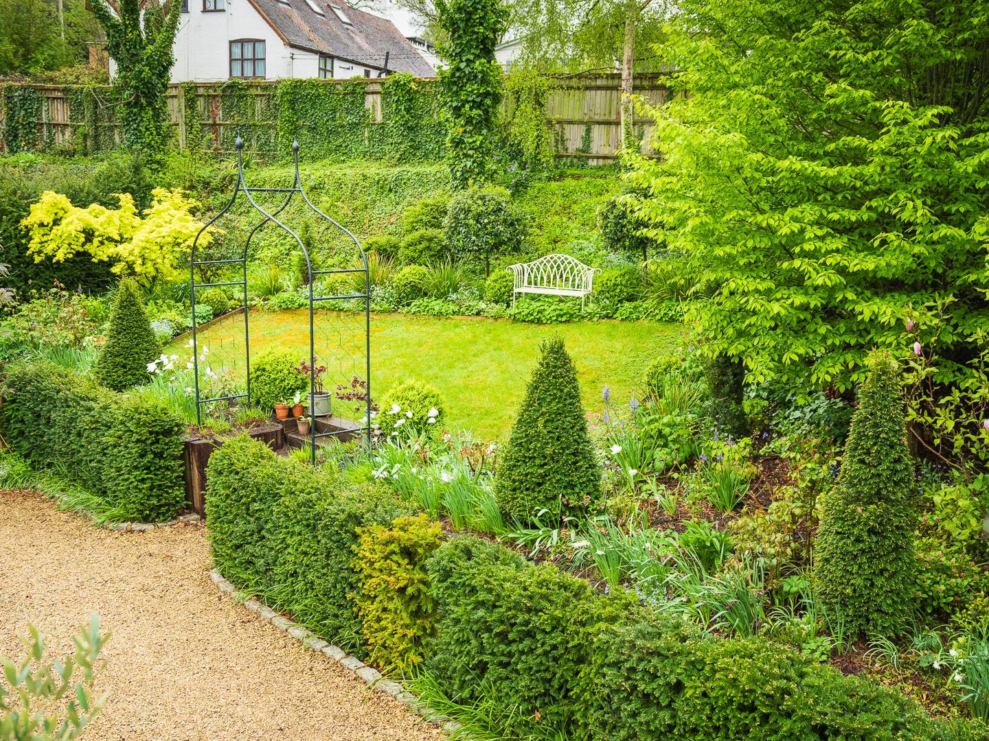 From this sun-drenched courtyard, cast your gaze across the gravel drive to the Cottage Garden. Already it feels like another world entirely - shadier, cooler, with its deep luxuriant verdancy. Up there, a white bench nestles between two shaggy Viburnum tinus standards. Is it just me, or is it beckoning us onward? Let’s leave this sun-baked corner behind and step into a deep green calm. Crunch… crunch… crunch…
