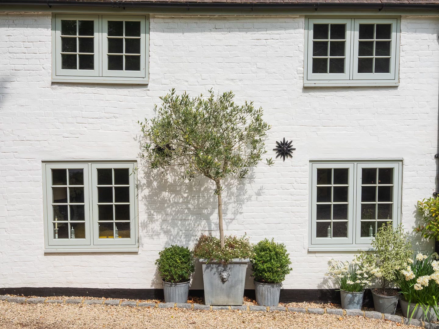 Crunching across pale cream gravel (a gentle nod to the nearby Cotswolds) we pass our largest olive. Still young but maturing nicely, underplanted with erigeron, all in a beautiful A Place in the Garden zinc planter. Yes, I’m name-dropping, but just look at it! Its fabulous! Admittedly, I do have a bit of a weakness for planters, as you’ll see.