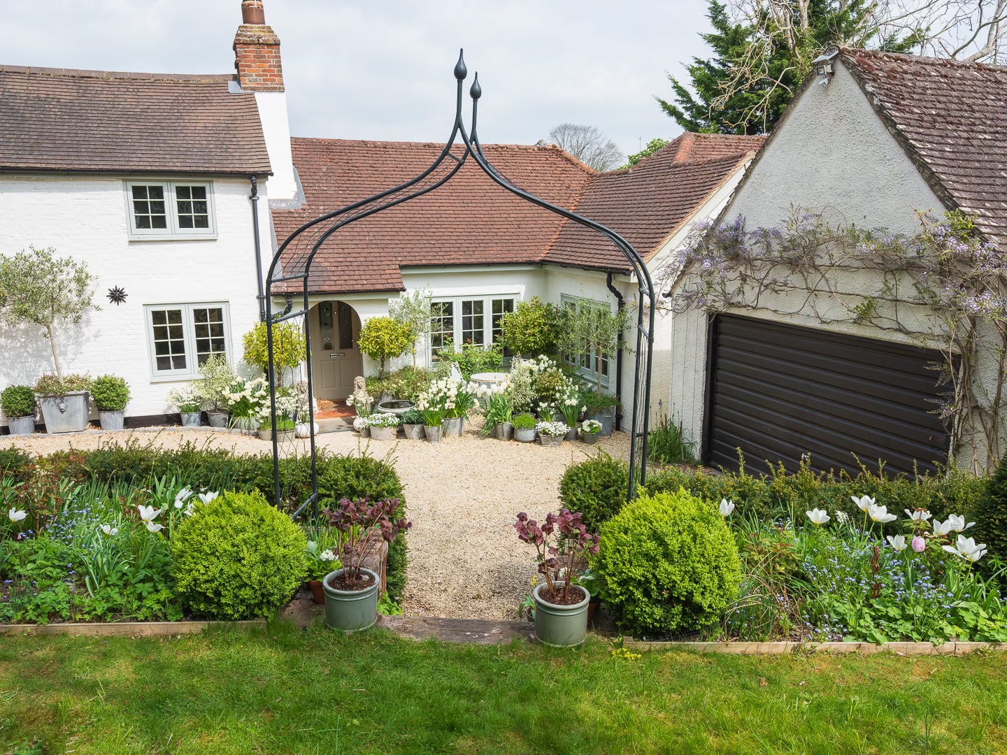 With the huge timber gates yawning on their hinges, you are most welcome to join me on a little tour. Don’t linger out there in the cold shade of the fir tree, step into the sunshine! It’s far more agreeable on this side. The warm air circulates here, heated in the sun-trap driveway, intensified by white walls, heavy with the very finest spring perfume. Step inside, my friend, and let the gentle hush of this hidden courtyard give you a little cuddle. So glad you could make it!