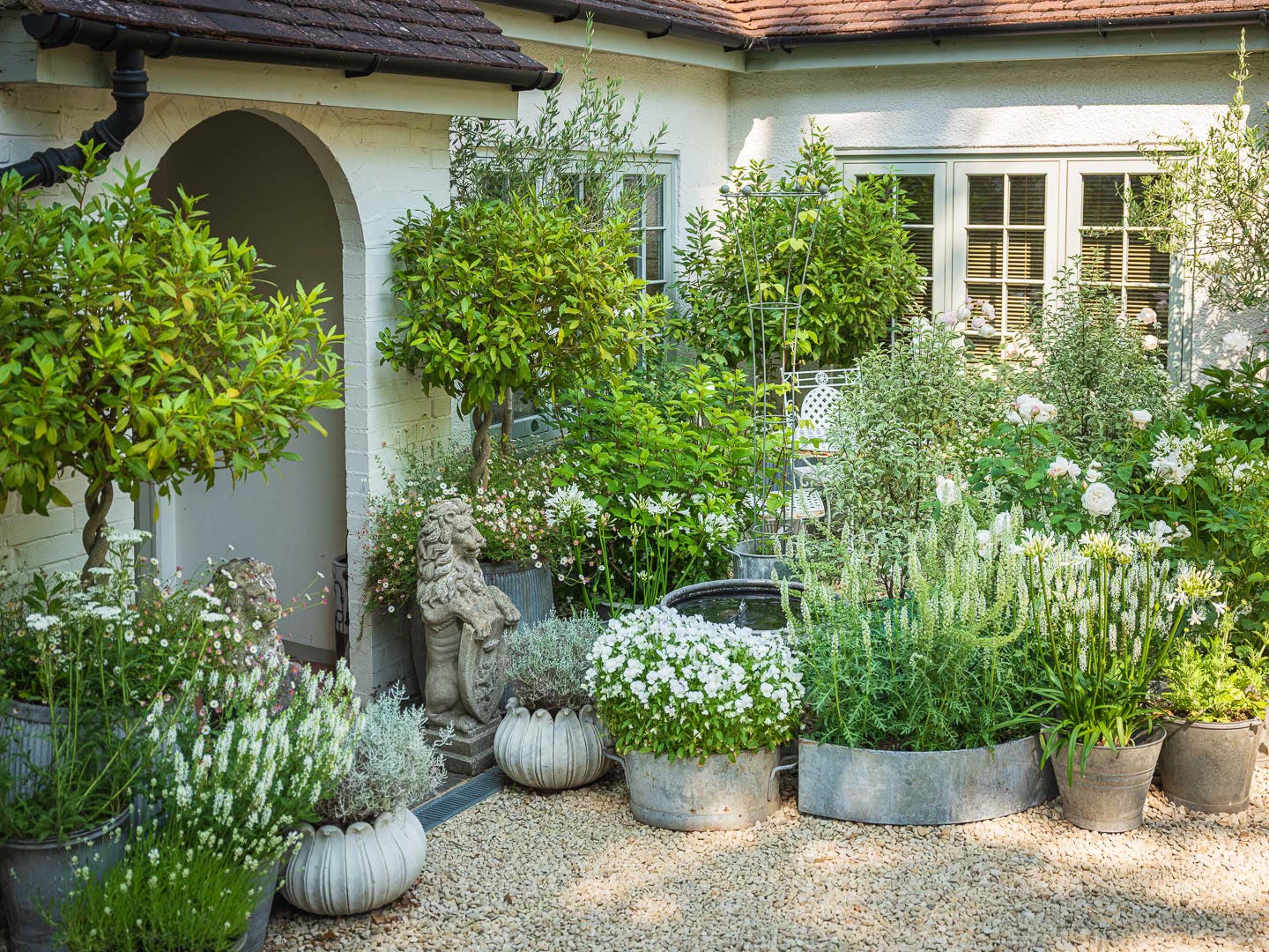 As we move closer, we pass a pair of armorial lion guards (a dash of theatrical fun) flanked by white marble bowls. A Lotus Bowl pool gently babbles, sending soft echoes of water and shimmers of light across the courtyard walls. The Courtyard Garden is really a study in zinc with the occasional stone or copper flourish: buckets, boiler pots, troughs, dolly tubs, baths, hoppers and tanks. A quiet industrial glamour.