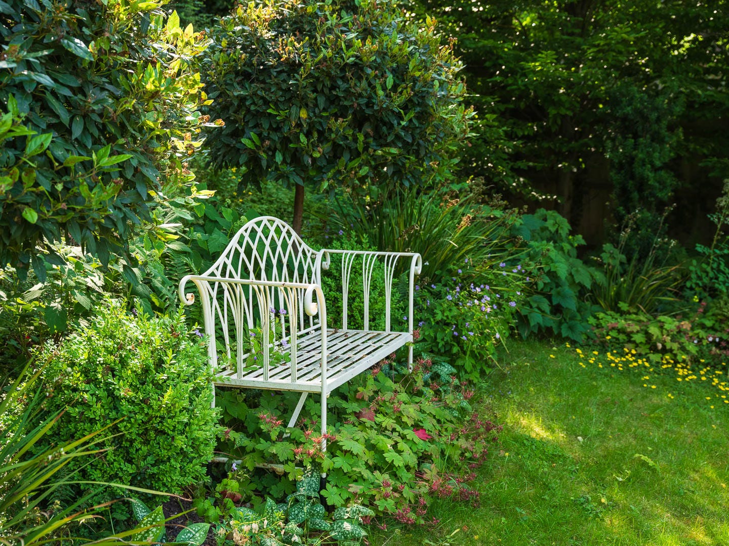 Let’s pause at the white bench, a focal point and a fine place to rest. It’s only up close that you’ll notice the Viburnum tinus ‘Eve Price’ either side, riddled with beetle damage. The leaves are almost scorched, they’re so badly chewed. Slightly distressing, yes, but that’s the trick to being a relaxed gardener: don’t look too closely.