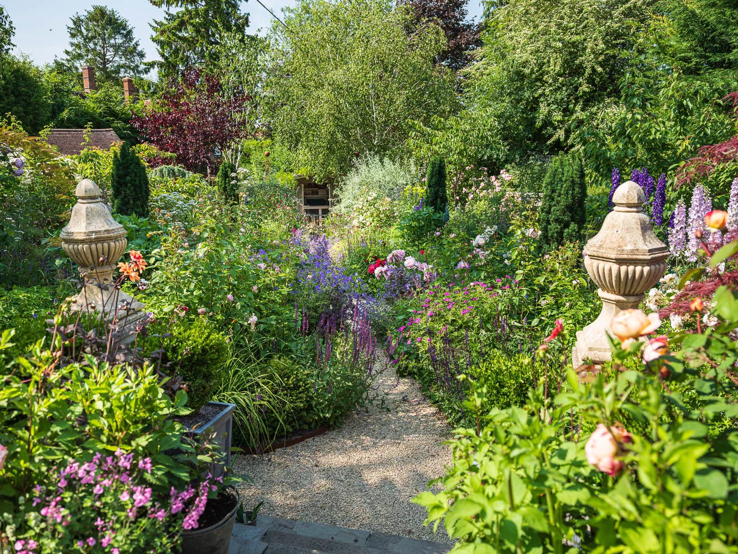 We descend the stone steps, pass between two stone finials, and land at the top of the 14m (45ft) long double borders. The path is barely a metre wide and the plants are enthusiastically trying to join the tour. Especially the roses that like to tap you on the shoulder, just in case you missed them.