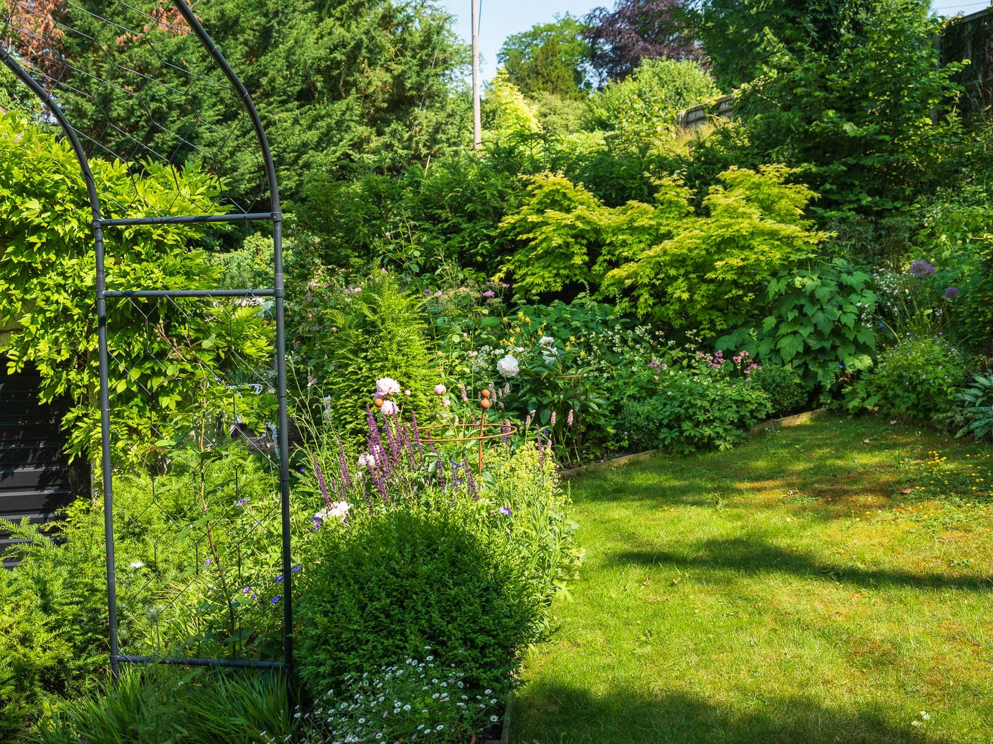 This is the calmest corner of the Flower Garden. A green retreat, slightly overlooked by a neighbour’s window, though you wouldn’t know it now. The planting has matured into a lush screen, cocooning the space in dappled shade and shelter from the Himalayan birch.