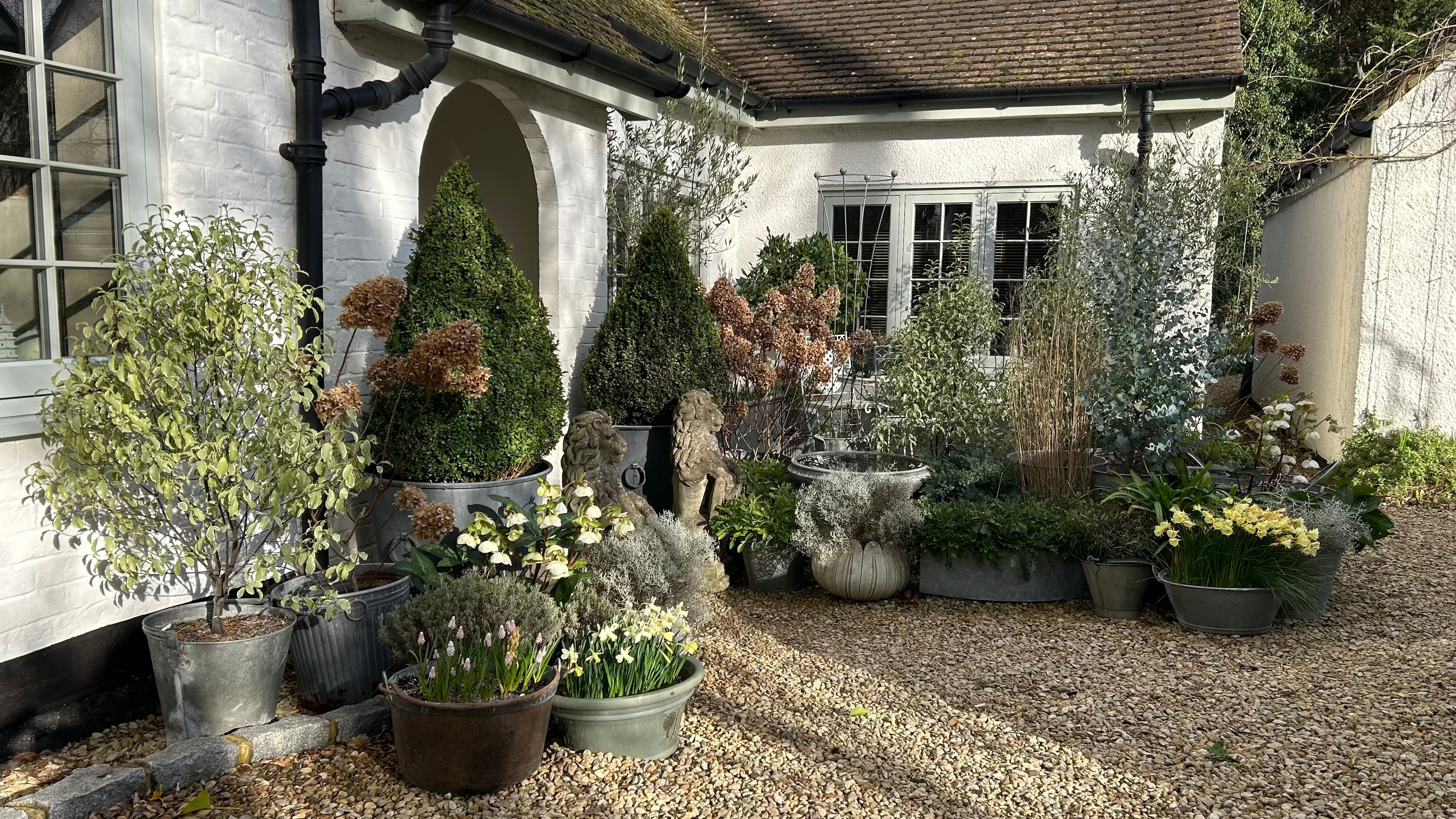 I heaved the planters into my arms and carried them round to the Courtyard. A ready-made display, cheerful and entirely free. The Courtyard, as ever, has worn winter well. There is still plenty of interest and greens aplenty from erigeron, scabious, pittosporum, olive, bay, wallflowers and buxus.