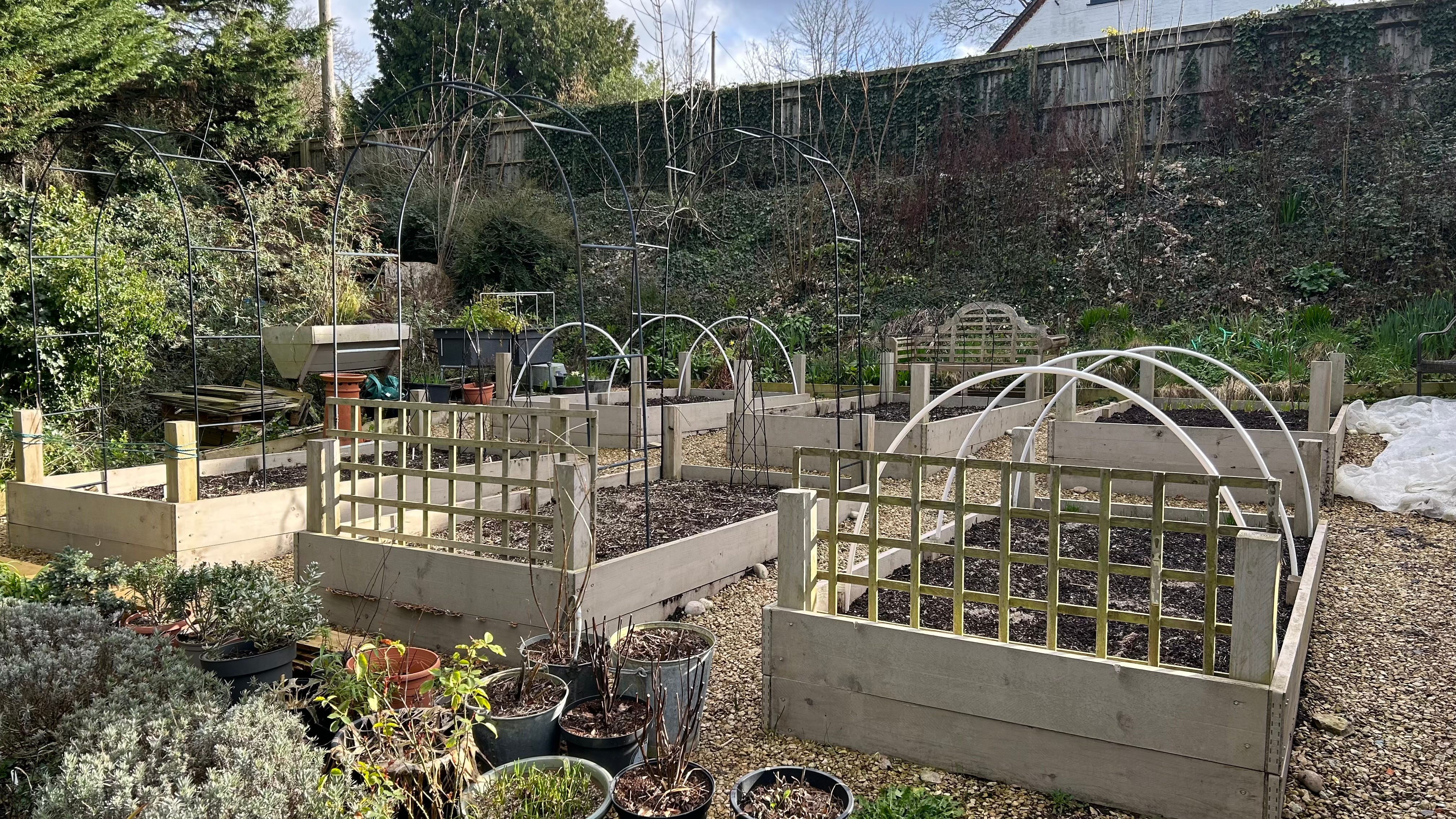 Emptying old pots, their former occupants long-since vanished, and recycling the spent compost into the garden compost bays. Gathering stray labels, plastic pots blown everywhere, tools, and old canes. I plan to chop the canes and stack them into bijou bug hotels. I also found a bucket of wood ash and sprinkled it over the kitchen beds.
