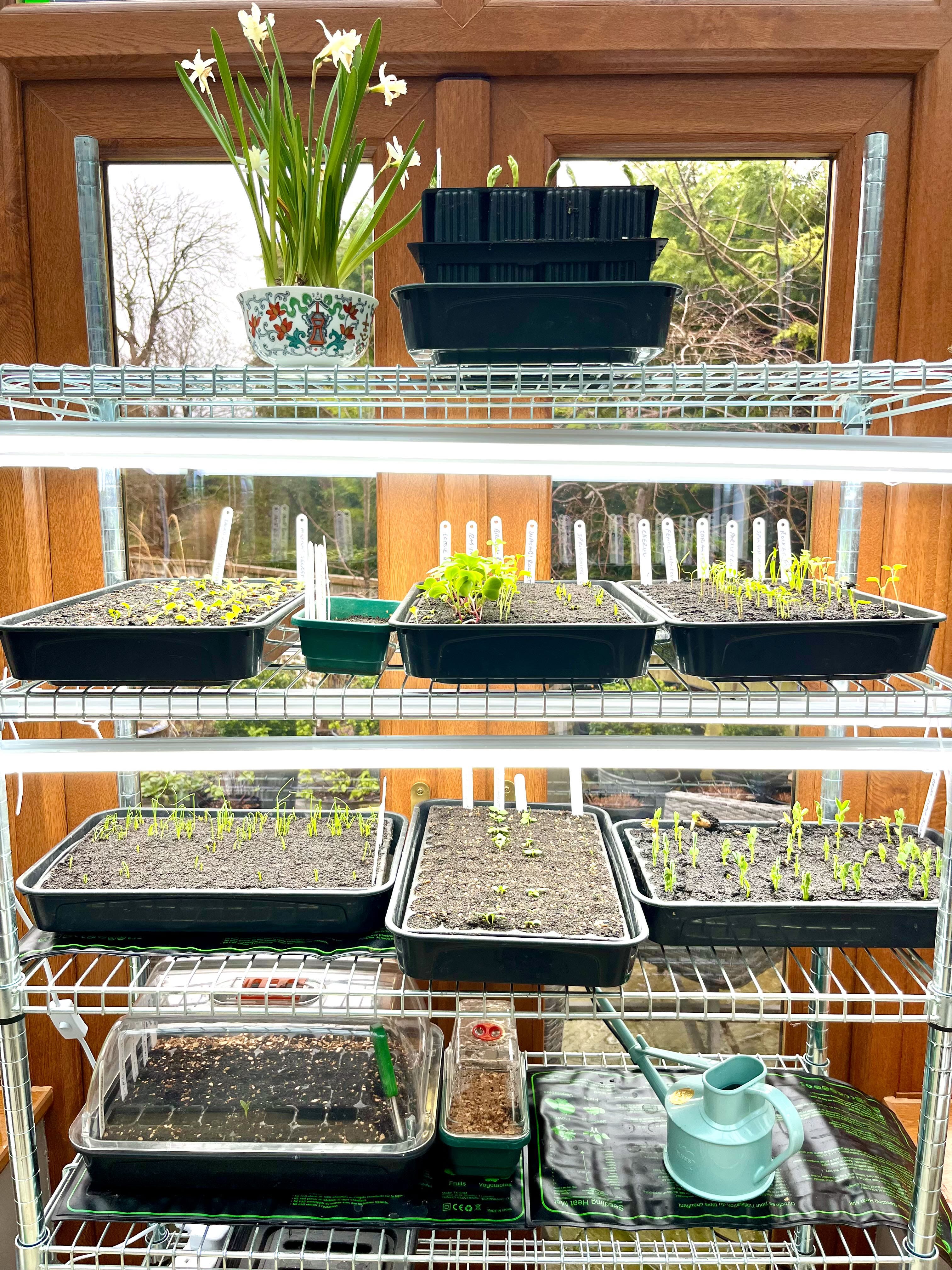 By mid-April, my conservatory receives enough daylight that I can position trays on the top shelf of the rack and the window sills. The room is generally warm enough, day and night, to switch off the mats. By May, it’s effectively a baking greenhouse and all the doors and windows are wide-open all day.